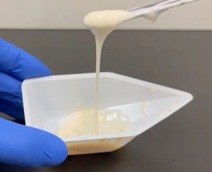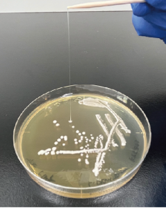 乳酸菌を探索している過程で、コロニーが糸を引く「曵糸性」を持つ株が見つかりました。この乳酸菌を乳酸菌用培地で培養すると、培養液がとろっと粘性を持つことがわかりました。このように発酵物に粘性を与える乳酸菌は、菌体外多糖(EPS)と呼ばれる物質を作り菌体や培地中のタンパク質の間に網目構造を作り、水分子が動きにくくなることで粘性を与えていると考えられています。こうした特徴を持つ乳酸菌は珍しいものではありませんが、この乳酸菌が作るEPSを調べたところ、多糖の構成分子にグリセロールが含まれていることがわかりました。菌体外に分泌する多糖でグリセロールを構成分子とするものは珍しく、他の菌体外多糖にはない機能や特徴を持つことが期待されます。